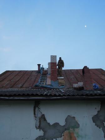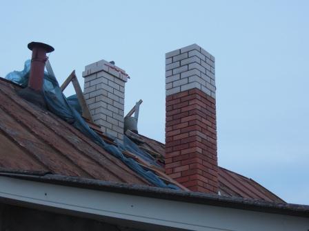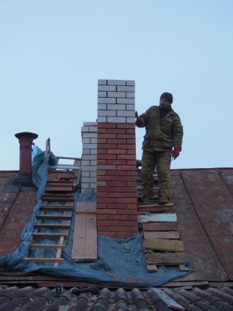 Уважаемые печники! В субботу проверял работу камина и печи. При направлении ветра от конька к трубам. Всё работало. Сегодня дул сильный порывистый в направлении от труб к коньку. При сильных порывах часть дыма выдувает из топки в помещение. Все параметры камина были указаны выше. Вопрос: при таком расположении труб и расстоянии между ними (как на фото) будет ли такое расположение (почти на одной оси перпендикулярно коньку) влиять на ухудшение тяги в камине (каминная труба - та, что повыше, нижние ряды из красного). Уточню: в дальнейшем каминную трубу нарастил ещё на 2 ряда выше, чем на фото. Точно не помню, но вроде бы она вышла всего на 1 см выше печной. Печная на 50 см выше конька, отстоит от конька сантиметров на 40. Ближайшие друг к другу стенки труб отстоят одна от одной на 90 см. В итоге каминная отстоит от конька где-то на 2 м. В дальнейшем решил проверить, как влияет печная на каминную и наоборот, убрал с печной трубы 5 рядов (кирпич полуторный), высота печной стала всего на 1 см выше конька, а каминная, соответственно, возвысилась на 50 см над печной. Эффект: печь работает прекрасно во всех режимах, несмотря на направление ветра от трубы к коньку и высоту почти вровень с коньком и на расстояние от конька всего 40 см. Камин по прежнему дымит, несмотря на то, что каминная труба на 50 см выше конька и выше печной трубы и несмотря на то, что отстоит от конька на 2м. Вывод: расположение труб здесь не причём? Причину в другом искать следует? Каминную трубу в дальнейшем разобрал до уровня крыши. Предполагаю разобрать до шибера и увеличить её сечение, поставить новый ещё больший шибер.Размеры ещё не знаю. Интересуюсь у специалистов. Подскажите, рационально ли увеличивать трубу до 3-х кирпичей внутренним сечением при портале 88х56х44 см? Или лучше вывести на, скажем 31,5х26,5 см (предположим) с последующим добавлением 5 см кусочков в кладку? И ещё вопрос: наличие колпака над каминной трубой, как считаете, решило бы проблему дымления в этой ситуации?