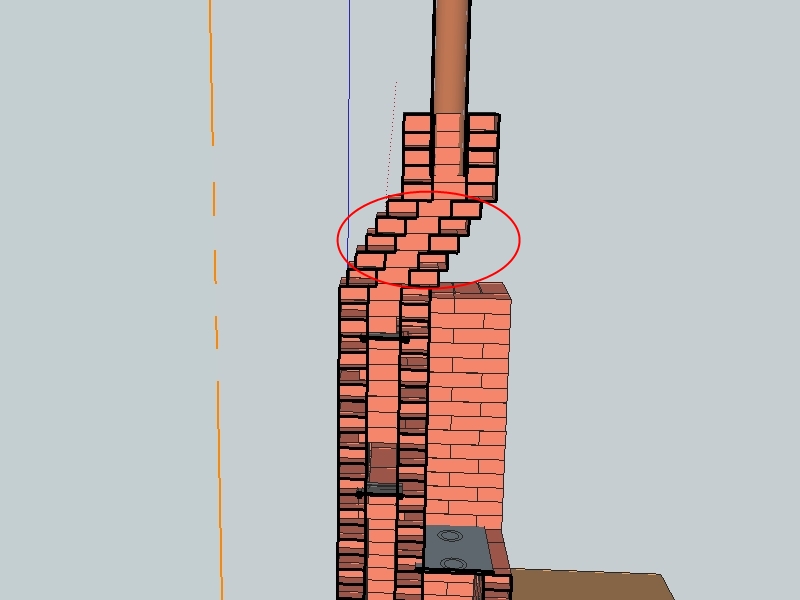 | Проше сделать дымовую камеру без навесов, потому как такие зубы в трубе не айс. Можно и чистку воткнуть, или ревизию из половинки кирпича. А разделка куда попадает. Уровень потолка где? |