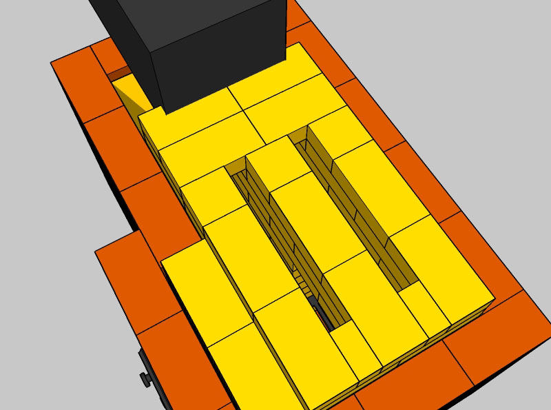 2. Система – прямоток. Параллельный прогрев камней и бака с водой. Нагрев воды регулируется распределением потока, т.е. регулируется плотность каменной закладки и сечение каналов у бака, которые можно частично перекрыть камнями или кирпичами.