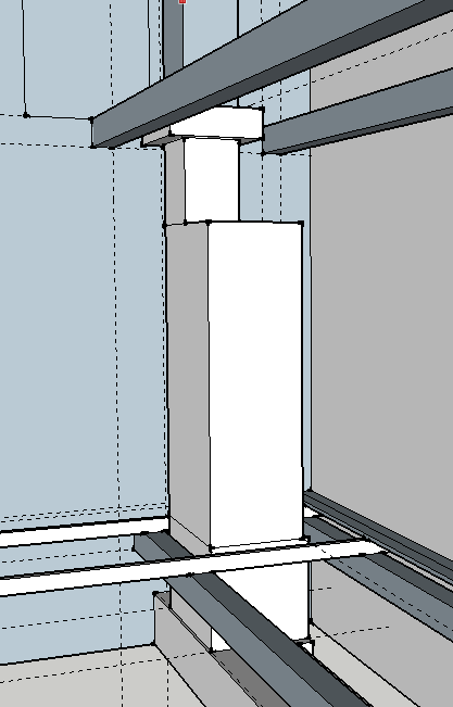 Но вот какая петрушка получается. Пошел перемерять все и кинул отвесы от балок и слеги, которая на крыше. И получилось, что никак туда прямую трубу не впинуть, если по правильному делать. С распушкой. Прикладываю картинку и скетчап с точными размерами.