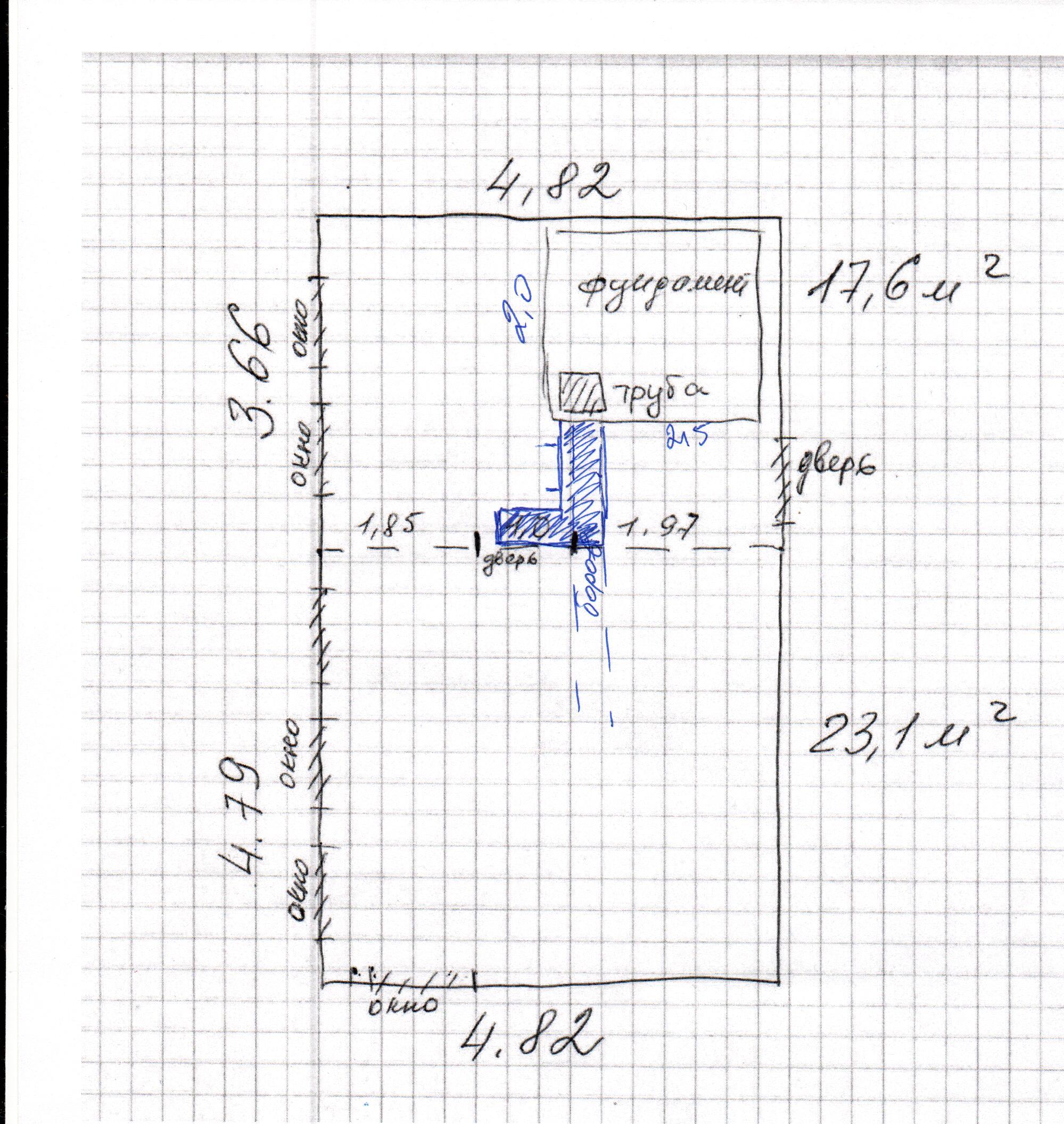 Правильно, надо всё расчертить с размерами. По моим прикидкам щиток от топливника с плитой вытянется на 1,6 м, с тем, чтобы совместить в себе трубу и выход на комнату...не красиво как-то.