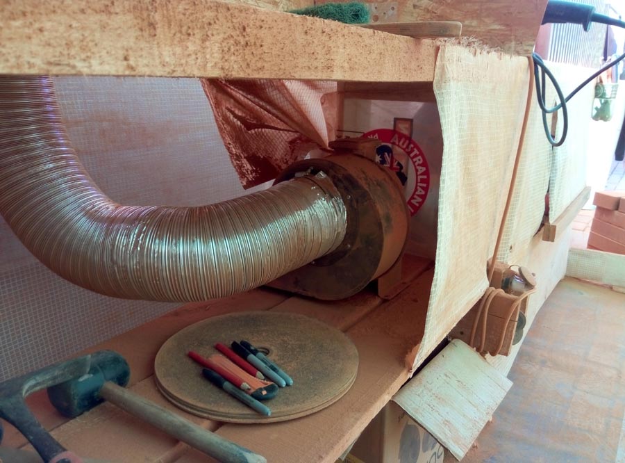 Пыль по воздуховоду сбрасывается в мешок, что не очень эффективно в плане пылеудаления. Если воздуховод вывести просто в сторону без ограничителя и помощнее вентилятор, то вытяжка будет работать эффективнее. Наш вариант полностью облако пыли не удаляет. Но в совокупности с маской защиты хватает.