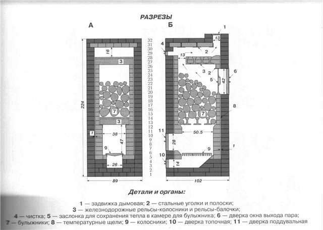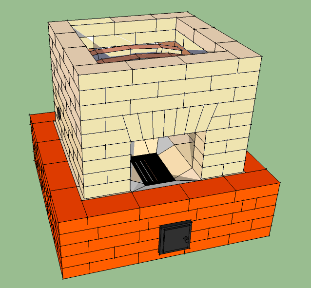 Я вижу в сети народ дачники прямоточку прокачивают 1) Шансы делают температуру с низа снимают 2) Сухудовы в виде вставленной трубы в топливник 3) Бак с водой не удачное решения особенно в парилках 2.20 метра. А вот как вариант небольшой колпак сделать ряда так под 6-7 и задвижку поставить летний ход .Решим вопрос с высокой температурой... ------------------------------------------------------------------------- Как ни старайся, но воду в баке выше 100 градусов не нагреть. Правила физики. То есть нагреть ее можно. Но уже в виде пара. И для мытья ее использовать станет невозможно. Для банных нужд ее желательно все же иметь в жидком виде. Поэтому выше 100 градусов — никак. А вот каменку нужно нагреть до температуры куда большей — 300 градусов. Только тогда можно рассчитывать на нормальное парообразование. Значит водяной бак и каменку нужно разнести. Иначе вода будет охлаждать камни. И хорошего мелкодисперсного пара не будет. Часто бак с водой ставят прямо над топкой. Но и эта система нехороша. Получается, что самый жар уходит на нагрев воды. И только во вторую очередь тепло расходуется на камни. И получается, что вода уже кипит, а камни еще холодные. Эффект забытого чайника на кухне. Пара много. Но это скорее туман, а не пар. Его температура низкая. Он крупнодисперсный. Получается, что и в парилки холодно, и видно плохо. Частично с таким эффектом можно бороться, регулярно заменяя вскипевшую воду холодной. Но куда девать получающиеся запасы кипятка — а его получается с излишком. Куда рациональнее сделать так, чтобы вода нагревалась одновременно с каменкой. А для этого надо снизить интенсивность нагрева воды, располагая котел или после каменки, или введя в конструкцию нагрев через теплообменник. То есть сам бак для горячей воде ставят в стороне. Но делают от него трубные отводы. И такой отвод петлей заводят в топку. Площадь нагрева существенно снижается. И вода нагревается много позднее. Что и требовалось. Кладка печки по сложности с котлом после каменки и нагревом воды через теплообменник в топке примерно одинакова. Разница в форме бака и технологии изготовления. Впрочем, бак после каменки располагают, как правило, над ней. А потому наполнение его возможно при наличии насоса — с ведрами на чердак много не побегаешь. Емкость же с теплообменником может стоять и у самого пола. Но вот пользоваться удобнее верхним баком. В этом случае можно поставить простой кран для водозабора и использовать его как напорную емкость для горячего водоснабжения душа. Включать банные баки в центральное водоснабжение не рекомендуется — слишком много возни с давлением. Бак-то плоский. Под напором его просто раздует. Впрочем, можно поставить внутренние стяжки, по типу анкеров в паровозном котле в районе топки. Но это лишние хлопоты, бесполезно усложняющие конструкцию. Все же более оптимальным стоит принять систему с обычным переливом без давления. А теперь давайте посмотрим, как происходит кладка простой прямоточной печи периодического пользования с закрытой каменкой и верхним расположением бака горячего водоснабжения. Строим печь Кладка ведется или с применением красного и огнеупорного кирпича, или целиком из красного керамического кирпича. Но самого отменного качества. Некачественный кирпич применять не стоит — слишком большие температурные нагрузки испытывает каменка. Начало такое же, как и у быто