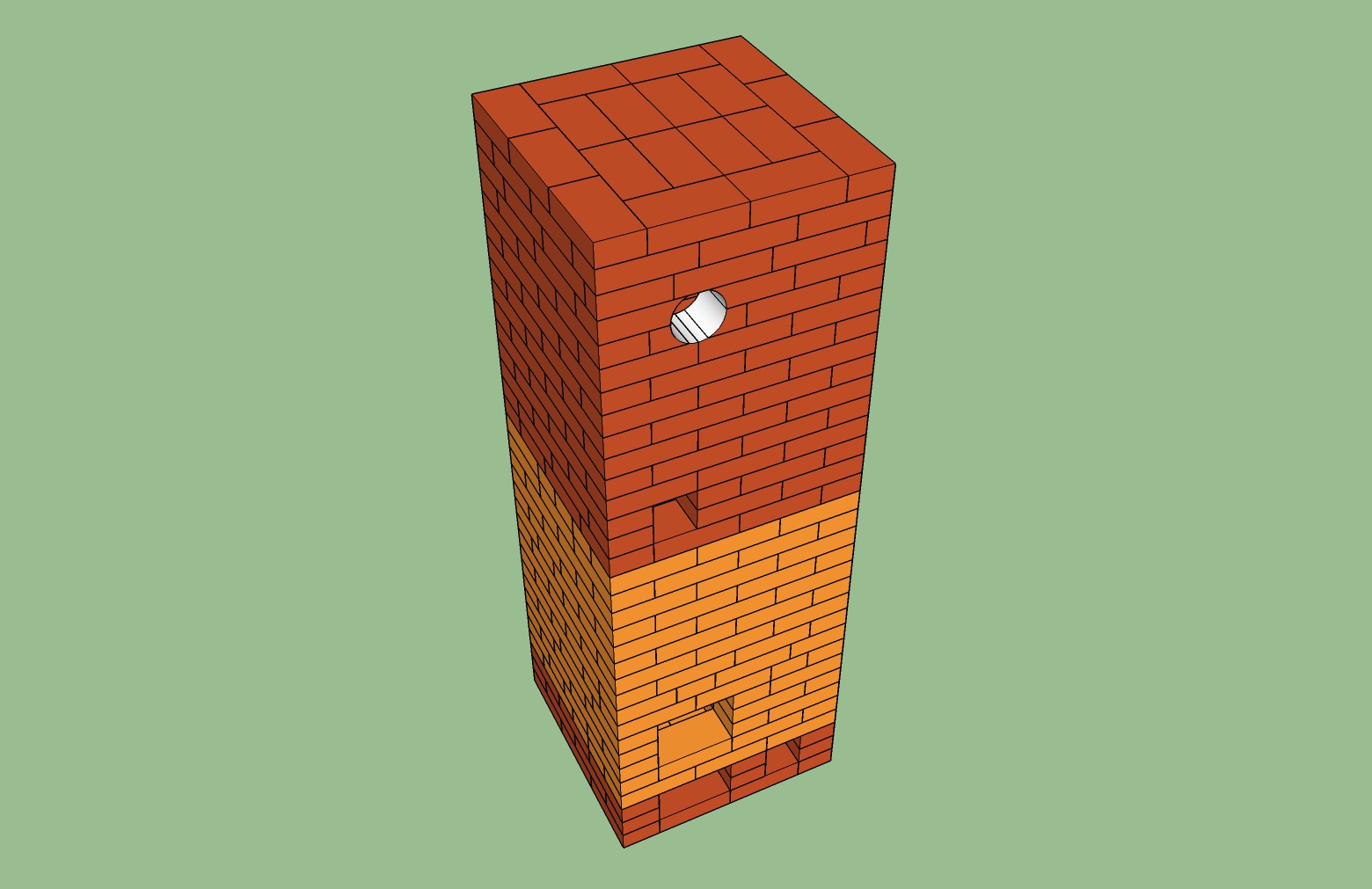 Продолжаю изучать варианты печи для загородного дома и остановился на вариантах от Порфирьева. В его книге есть вариант 770 на 640 и 770 на 770. Больше по размерам подходит 770 на 770 но у него топливник только на один кирпич в глубину. В sketchup сложил нижнюю часть по принципу от малой печи и верхнюю от большой. Вот что получилось. С противоположной стороны подключу буржуйку. Труба - сэндвич с боку (показан над топочной дверцей). Шибер думаю ставить вертикално прямо перед переходом на сэндвичь.