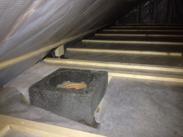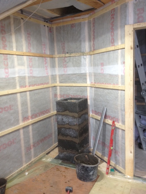 Пришла весна и настало время заканчивать трубу .Вышли на крышу собрали леса подмости за 2 часа собрали 8 кубиков этой прекрасной трубы. Был заказан короб в цвет крыши с колпаком , в итоге сделали самопальный верх оголовка из нержи закрыв от боковых осадков намокания ваты. Шамот прекрасно режется как масло без замачивание в воде структура на срезе однородная без примесей.