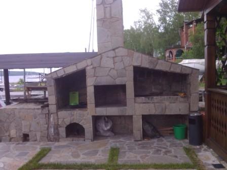 А это шикарный комплекс печника из Сочи. Сколько интересно "прожил" этот комплекс со стенками топки в полкирпича и псевдожаростойкой смеси "дюна"- если конечно им пытались пользоваться.Как выдержат такой вес (около трёх поддонов кирпича) тонюсенькие стенки топки мангала и притом подверженные нагреву? И зачем такая массивная нахлобучка(дымосборник и труба) ? Зачем такая большая труба на два очага.?