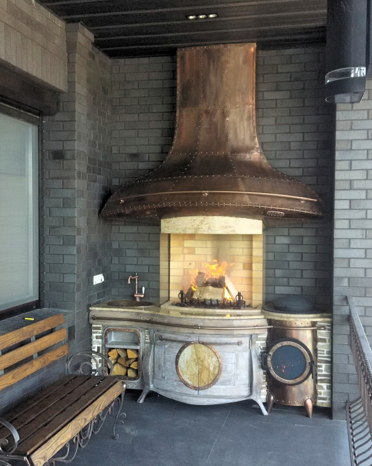 В смысле? Обычные материалы. Топка шамот, столешница гранит, тумба состаренный патинированный дуб, мойка медь ,верхний колпак медь клепанная. В верхний колпак встроенная вытяжка на 4 скорости над казаном. В казане самодельная дверка стилизованная под иллюминатор.