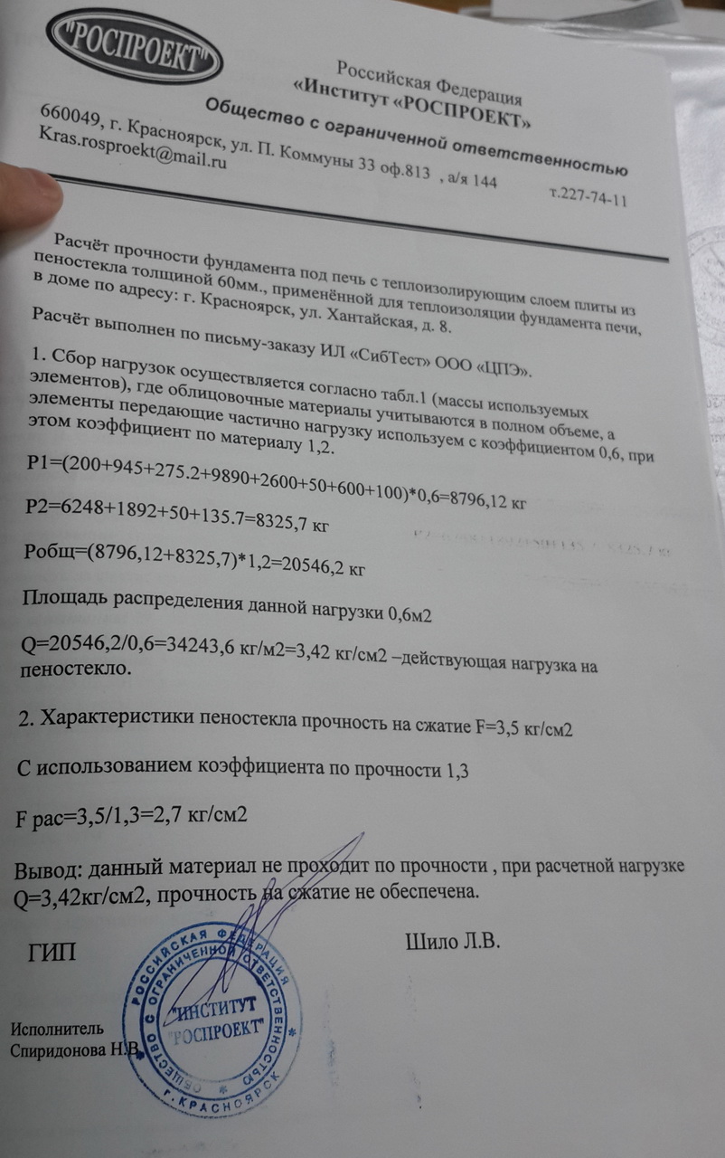 Минчанин не замедлил опубликовать фото "просевшего" основания с пеностеклом под двухконтурной печью, а следом и сфабрикованный протокол расчета нагрузок.