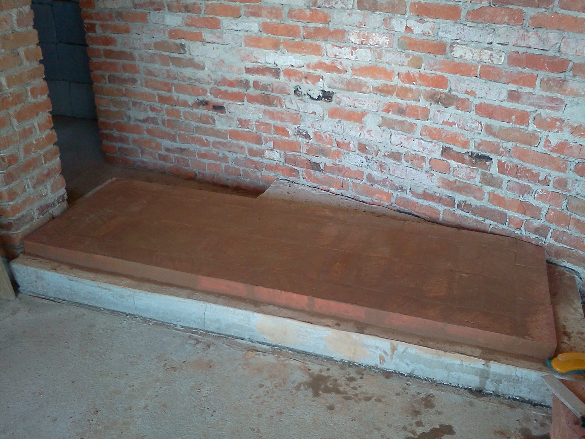 Шамотные кирпичи, стоящие на ребро с 13-го ряда и лежащие на них из 14-го ряда отделены базальтовым картоном от вышестоящих - с этим вроде все понятно. Непонятным остается реализация правой части - трех кирпичей, лежащих на красных кирпичах из 13 ряда.
