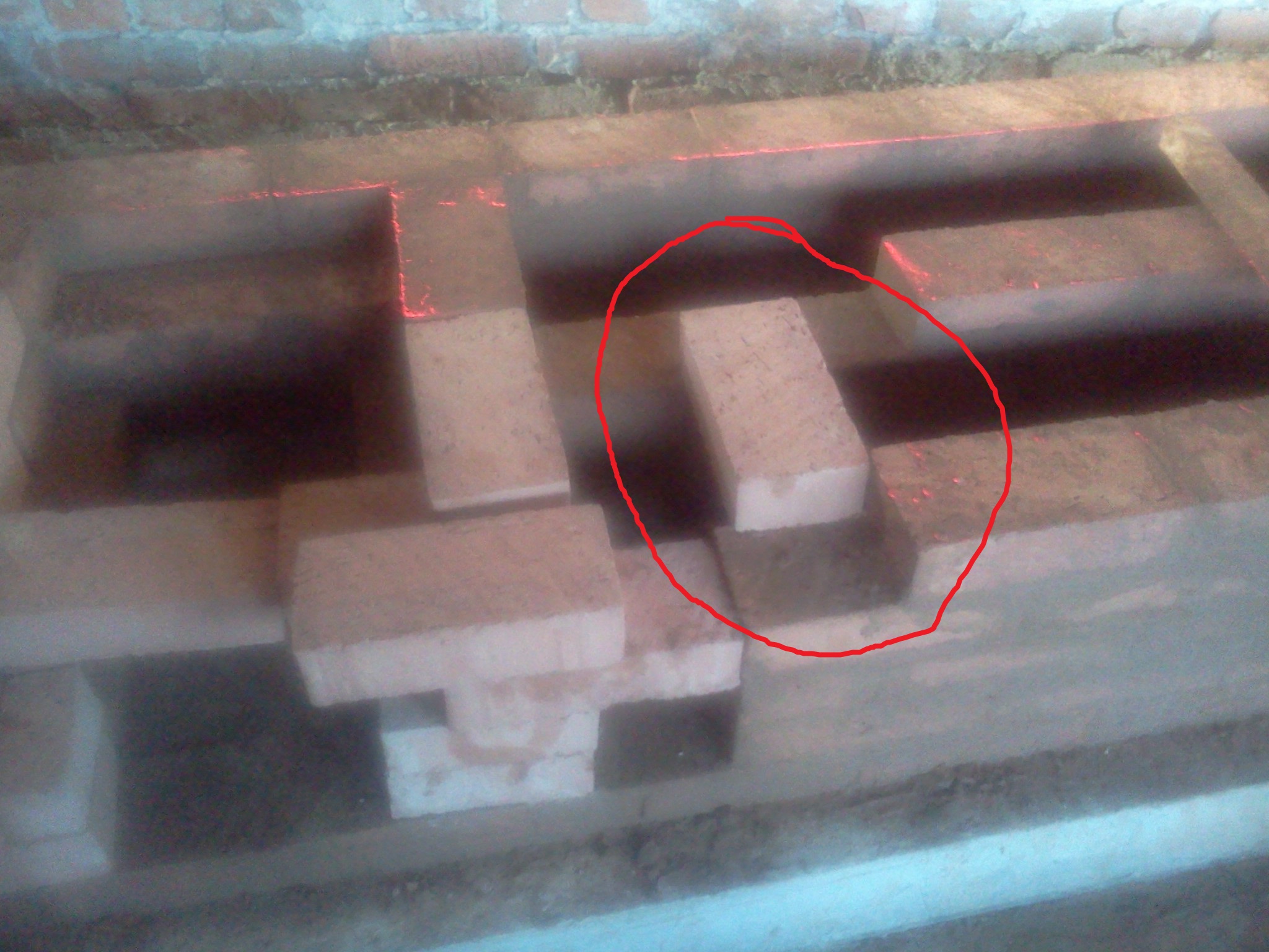Думаю уложить их через картон (желтого цвета на фото), далее 5-й кирпич класть уже на ГПС. Непонятным остается нужен ли зазор между кирпичами №1 и №4, и между 2 и 6 ?