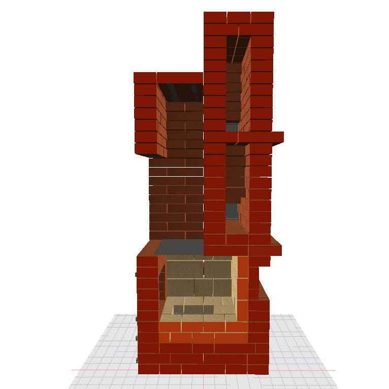 Красным показаны уголки 50х50. Смущает разница в коэф. теплового расширения (КТР) кирпича и металла. Футеровка ходов вермикулитом, но программа не позволяет создавать свою библиотеку.