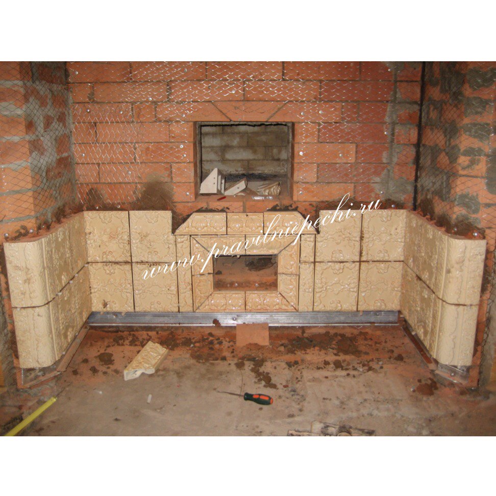 Наталья, почему "поверх"? - я думал о том, что бы утапливать изразцовые элементы в кирпич, т.е. их плоскости будут на одном уровне.