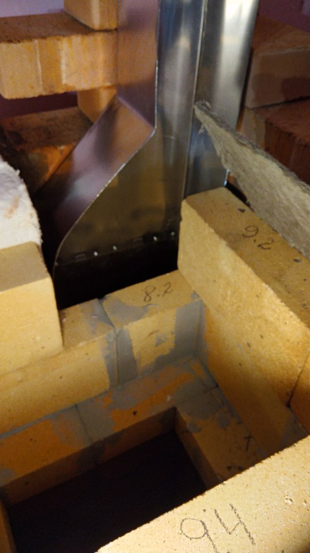 Так то конечно надо бы полностью футернуть канал лещадкой но размер печи не позволяет ,киричек Лоде на облицовке больше 300 градусов трещать по палам любит .Выход из топки повесил самопальный отбойник из нержи внутри вата каолин напротив хайла перестраховка от перетопа надеюсь его хватит на года 3 .