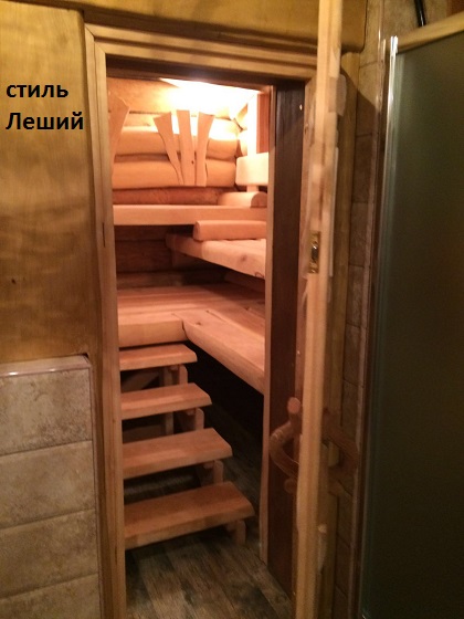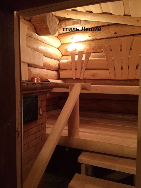 Вот еще одна банька в стиле Лешем. С высоким(диагональным) потолком 3,9 и 2,7м (по диагонали). Объем, стояла задача сохранить.