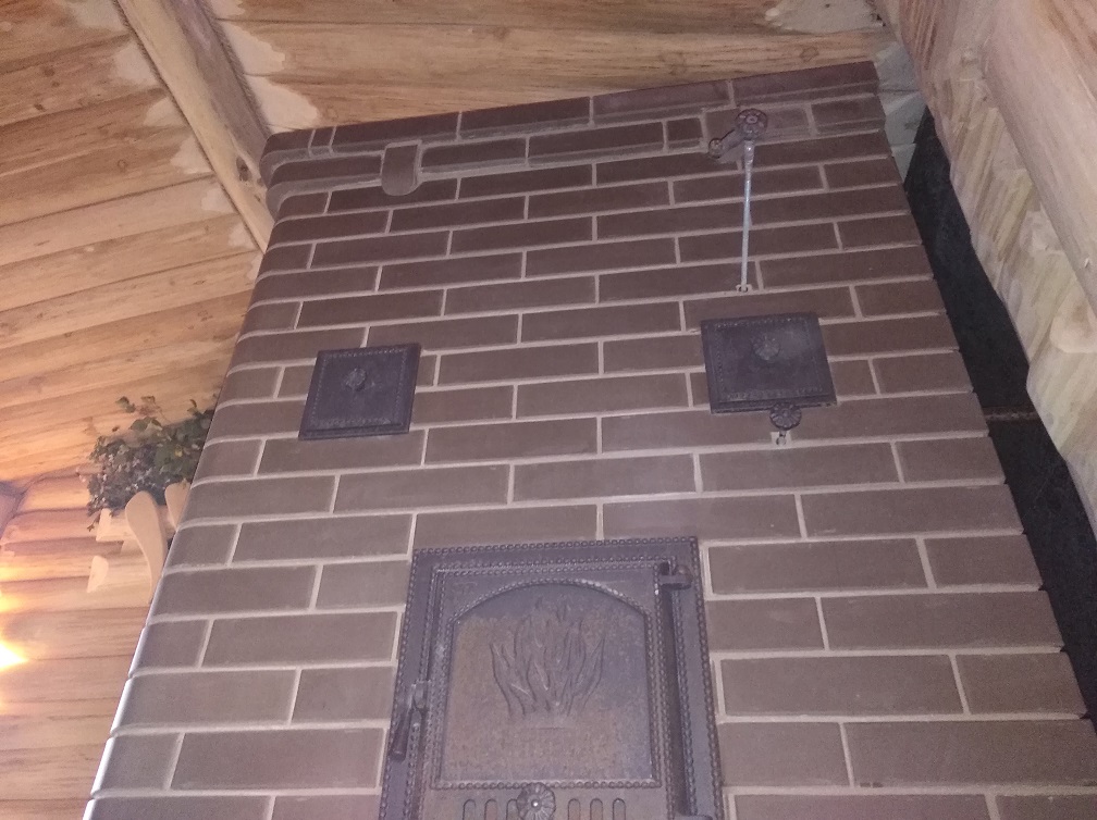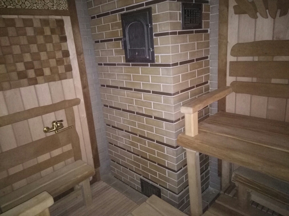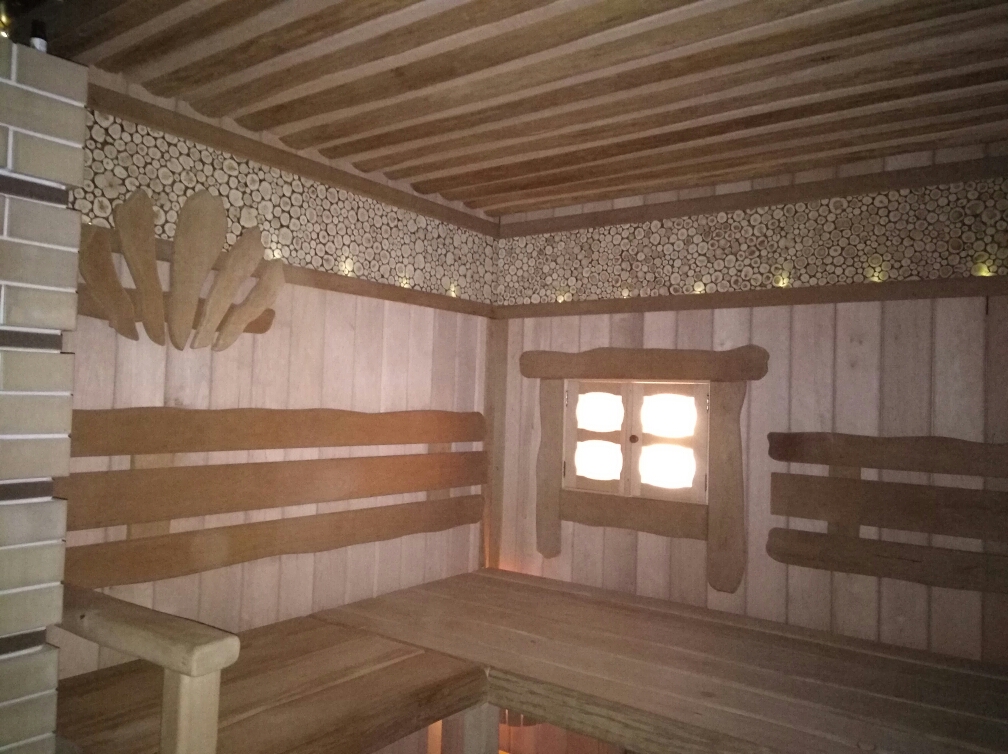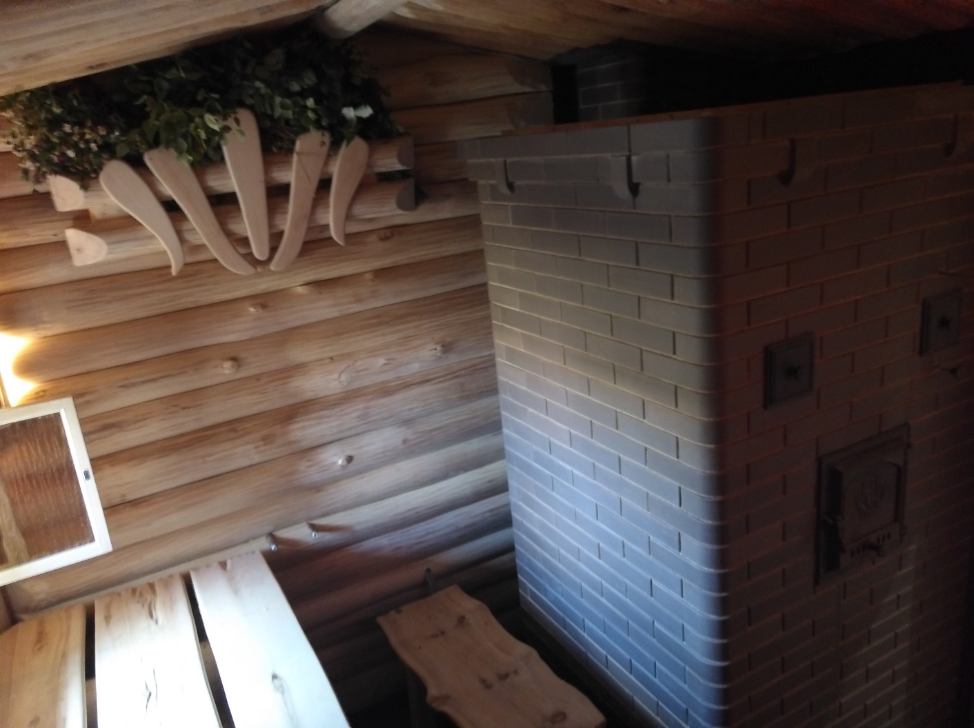 Парная 4х4м высотой 2,65 м. Печь из ригельного кирпича. Утеплена парная пробкой. Отделка доской термо ольха 40мм толщиной. В парной большое окно. Полок в этой бане уникальный. Он состоит из 3х ярусов.