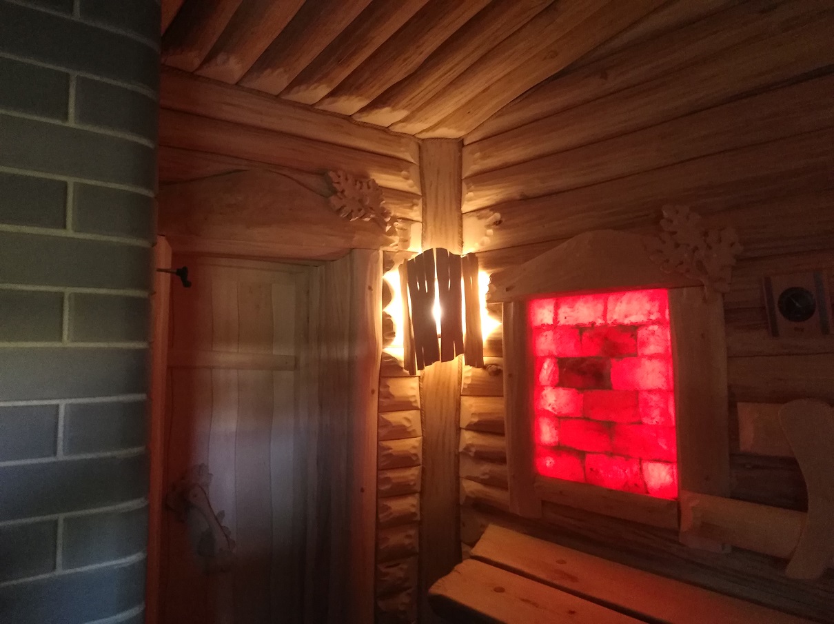 В парной есть слив, окно для проветривания, заведена гх вода, установлено соляное панно.