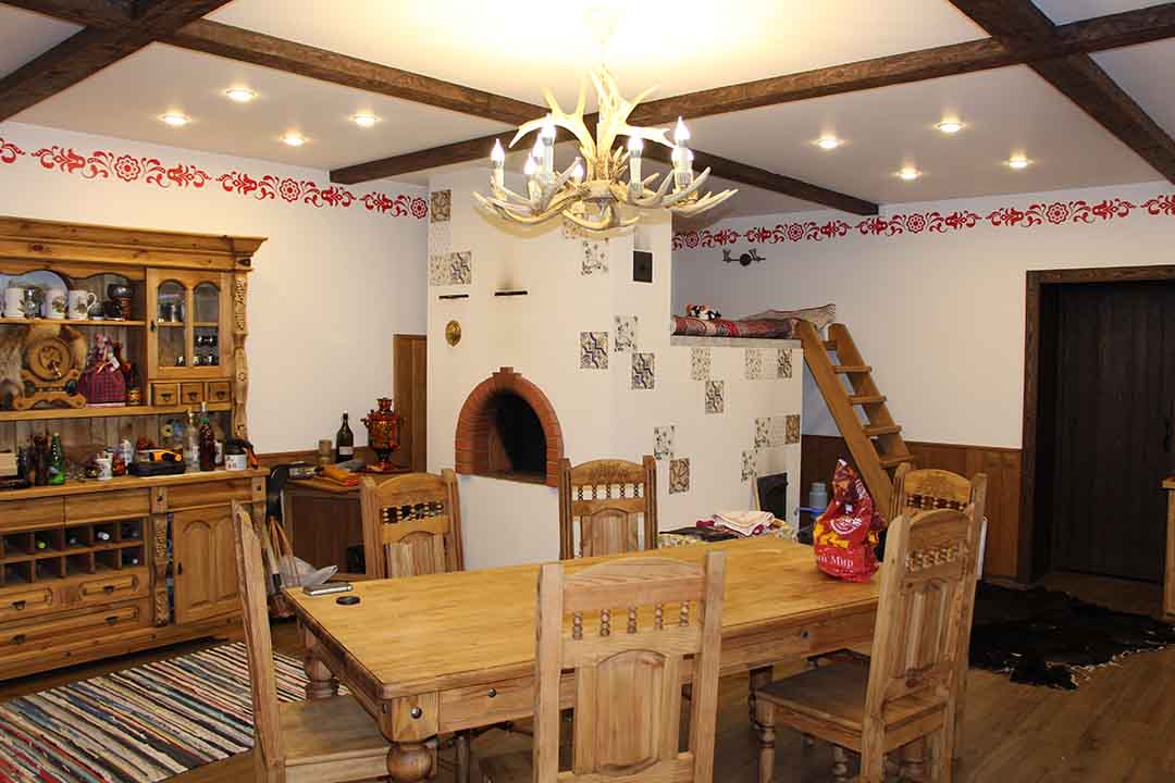 | А мне люстра с рогами и славянские узоры на стене понравились больше. |