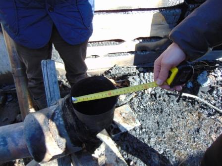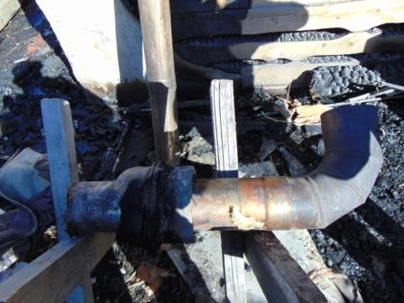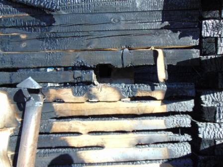 По моему неквалифицированому мнению, пожар вообще не от печи пошёл. Смотрите: мы считаем, что причиной возгорания стала неправильная разделка ДТ в деревянной стене. Тогда эта дырка под гильзу и должна была стать местом начала возгорания. Однако на фотках видно, что как раз отверстие целое. На фото с фасадом печи видно, что максимальные повреждения у досок в левом углу. Логично предположить, что возгорание началось оттуда?