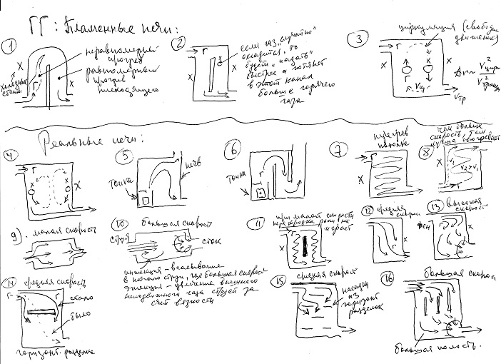 Исходной практической точкой рассуждений у ГГ была схема нагрева холодного перевального узла горячим газом, подаваемым снизу (рис1). Разумно предположить, что подаваемый горячий газ устремляется потоками ("языками") снизу вверх в холодном воздухе. И нагрев стенки восходящего канала будет возможным лишь при касании горячего языка стенки, то есть случайно и хаотически из-за колыхания языка. В опускном же канале языков быть не может, и стенки опускного канала прогреваются равномерно.