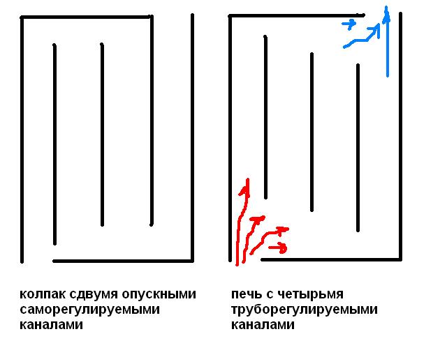 | В рассматриваемой вами печи два подъемных канала в печи двухярусный колпак яляются, если точнее сказать, переточными каналами. Саморегуляция осуществляется за счет, как самого нижнего колпака, так и снижение зависимости от тяги трубы вторым колпаком. |