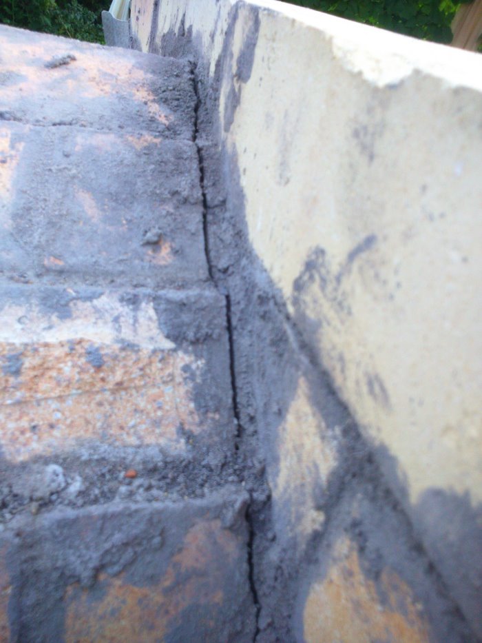 Что думаю делать - расширить трещину, увлажнить и по новому замазать мертелем. Верхний передний ряд кирпичей связать с задним металл стержнем с резьбой через прокладки из базальтового картона.