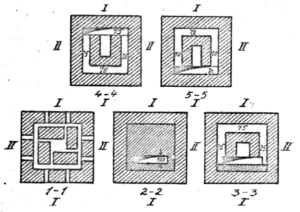 Уменьшение высоты ярусов, т. е. увеличение кирпичного массива в верхней части печи, способствует более интенсивному прогреву ее нижней части. Наличие по оси печи массивного, но хорошо прогреваемого, благодаря П-образному сечению стержня, связанного с наружной рубашкой толщиной в 1/2 кирпича небольшим количеством горизонтальных рядов в 1/4 кирпича, способствует медленному и равномерному остыванию печи.