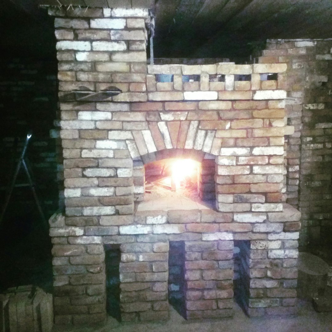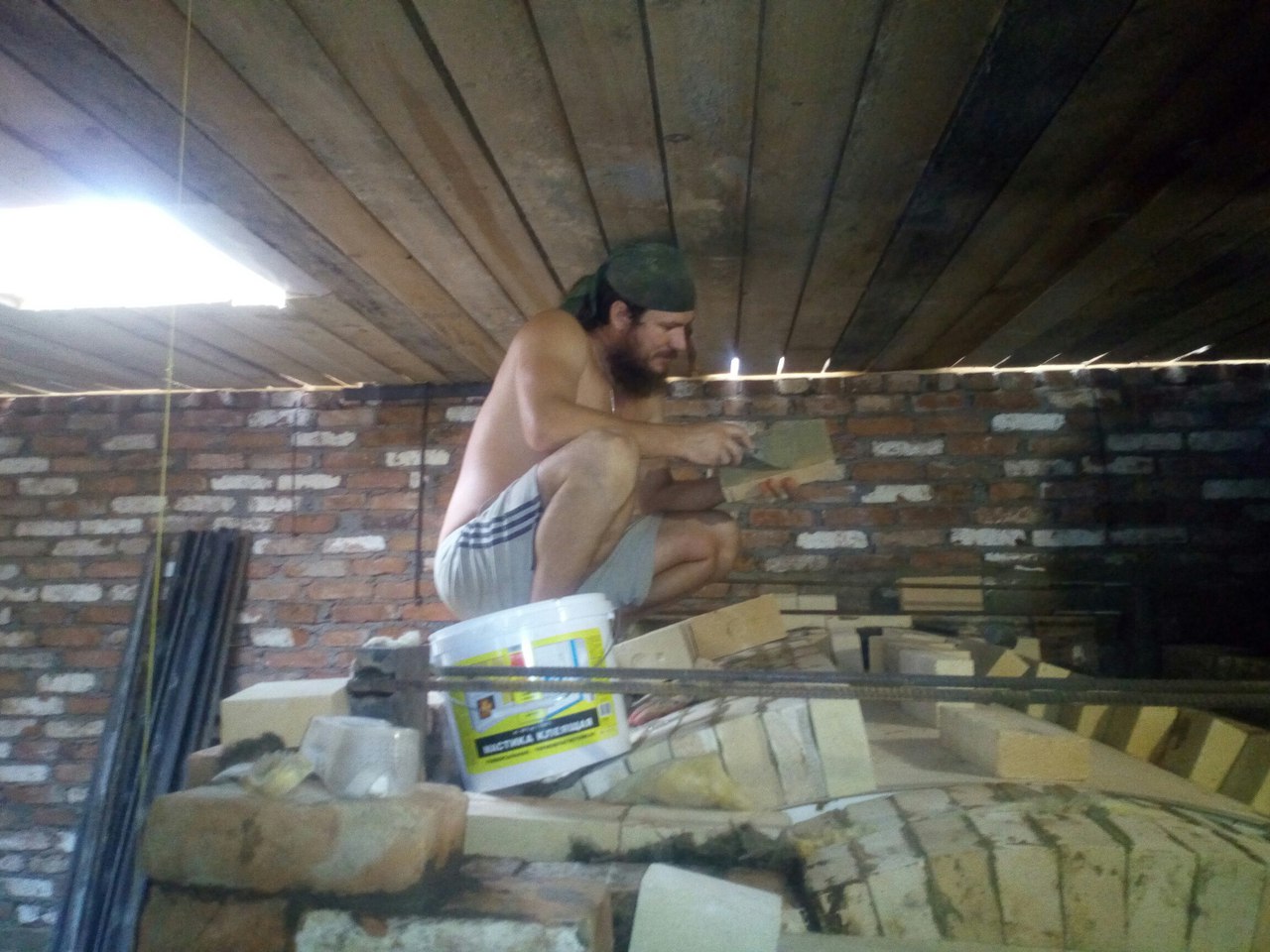 Для чистки кирпича, просеивания песка и глины мне были выделены помощники (спасибо Егору, Артему и Вячеславу). По ходу работы я привык к этому кирпичу, за три ряда до пода клал кирпичи на цементный раствор, потом перешел на глиняный.