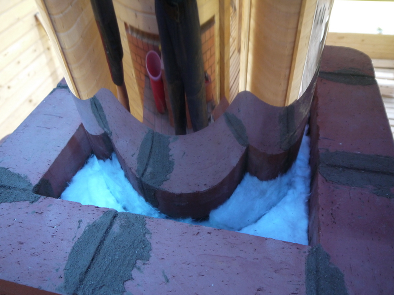 Если кирпичную дырку сделать покруглее, то можно сколхозить и без опорной площадки. Явное преимущество в том, что сэндвич можно будет легко менять без разборки кирпича. Дополнительная вата вокруг сэндвича, думаю, лишняя, достаточно только в самом низу для герметизации стыка. На фото Крафт. Базальтовая вата прикрыта Суперсиликой, ей же проложен стык: