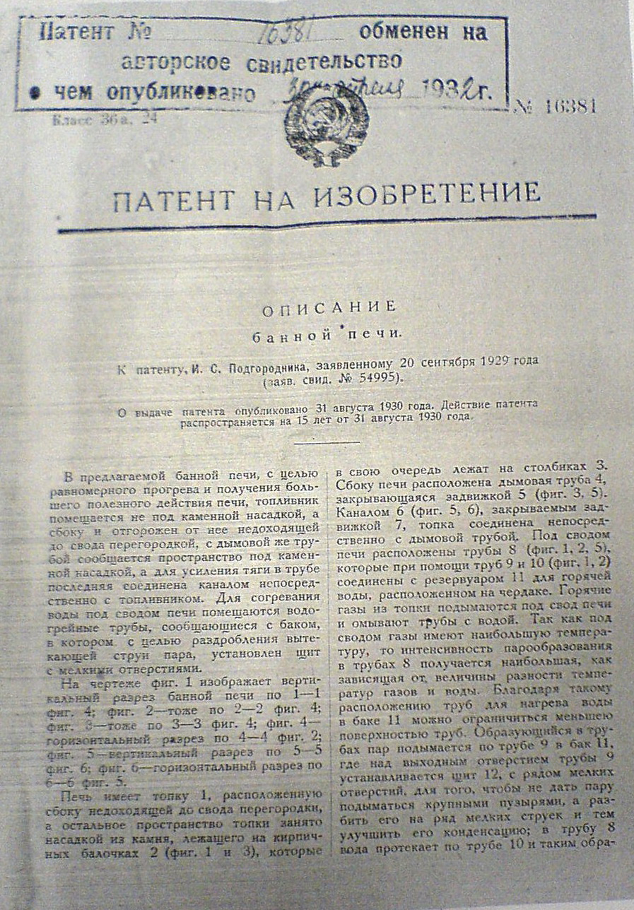 2. К началу 30-х годов в СССР с НЭПом и частной собственностью было покончено. В СССР вводится еще один вид охраны изобретения – авторское свидетельство. Патент сохраняется практически только для иностранцев, а для советских граждан – авторское свидетельство. Оно фиксирует авторство изобретателя и дает право на денежное вознаграждение в случае использования его в народном хозяйстве. Монопольное право автора отменяется, всё принадлежит государству. В связи с этим Подгороднику в 1932г. меняют патент на авторское свидетельство (номер сохраняется). Думаю, что поэтому дочь Подгородника, Алла Иосифовна, в журнале «Сельское строительство», в котором она поместила статью о банной печи своего отца, указала дату проекта – 1932г, т.к. в 1989 году у неё уже других сведений и документов не сохранилось. Да и отец уже 30 лет как умер;