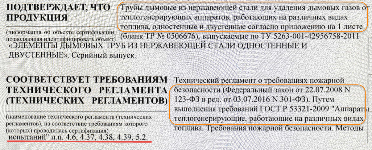КДМ получили настоящий "красный сертификат" на трубу, в том числе и трехконтурный С ВОЗДУШНЫМ ОХЛАЖДЕНИЕМ о соответствие техническому регламенту о пожарной безопасности и всему ГОСТ Р 53321, в частности пп. 4.39 и 5.2 (техническая документация).