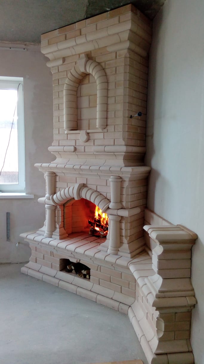 Как не кирпичный. Самый настоящий кирпичный. А снаружи облицовка выполнена мастерами из Италии. Сначала этому олигарху хотели впарить топку чугуниевую. Он наотрез отказался . И топку они уже купили и привезли. Он настоял -найдите мне мне печника чтобы построил камин из кирпича -но не такой как в фильме "жмурки". Его этого клиента тоже зовут Михалыч. И он настоящий персонаж из 90-х -а не художественный вымысел в образе Н.Михалкова. Коммерсы и трубу уже заложили для европейского камина с сечением меньше чем для кирпичного. А каминчик то он захотел приличный -большой. Вот пришлось рисковать,строить и бояться что он как и Михалыч киношный сожгёт меня в камине. Слава богу -прокатило. Камин заработал -на фото первая протопка. Ох как там опричники проверяли тягу досконально. Я даже и не знал таких способов проверки. Ниточек навесили на проём портала -фиксировали в какую сторону ниточки отклоняются. Проверили прибором измеряющим скорость движения воздуха, газоанализатор припёрли -проверить содержание СО в помещении. Экзамен сдал -иначе в топке сожгли бы.