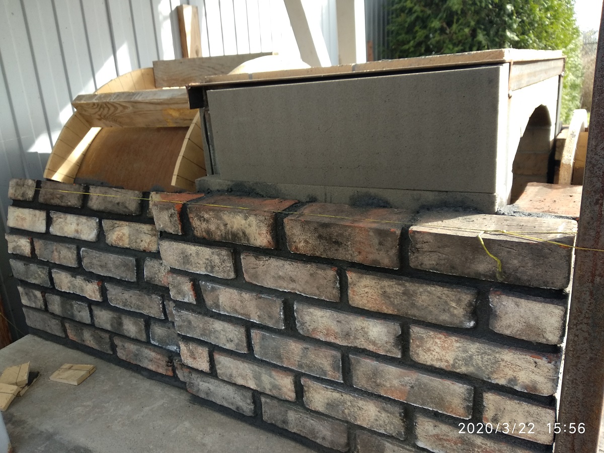 Заднюю стенку доделал, она будет служить опорой для стального листа. Спереди лист будет опираться на дугообразный разделитель который я вырезал из жаростойкой плиты.утеплитель уложил, стальной лист, который будет служить опалубкой закрепил на анкеры в плиту через уголок. Теперь надо решать ребус - как совместить круглое с квадратным - надо ли перевязывать и как лицевой кирпич арки с лицевым кирпичом шестка (прямоугольной кладки)