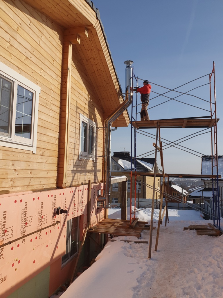 И в заключение, заказчик пригласил меня на строительство печи, когда уже дом-баня был построен, и даже залит фундамент под печь. Ему пришлось выбирать из двух зол, либо дымовая труба идет через спальную комнату, либо труба на улице с горизонтальным участком. Он выбрал второе.