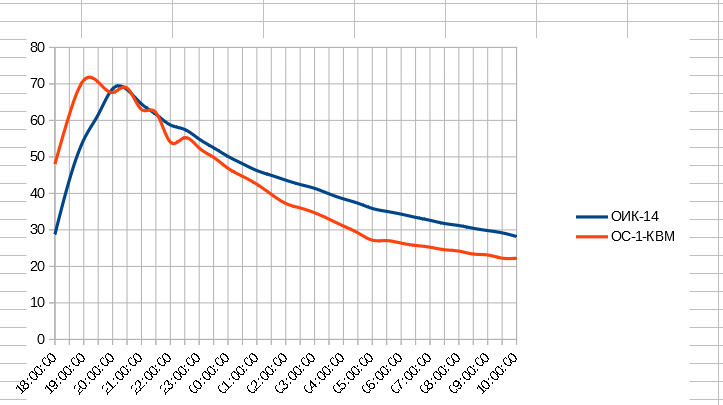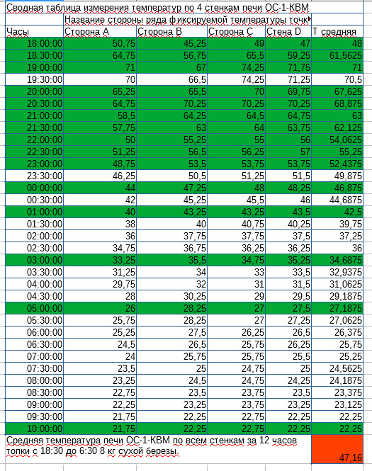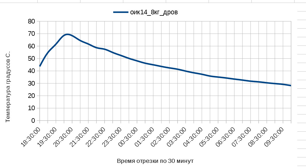 Здравствуйте, график это наглядное приложение к видео. В ролике я подробно это все объяснял. Печь топилась с 17:00 до 10:00 для всех показателей которые я вычислял использовался отресок длиной 12 часов с 18:00 до 6:00 что бы определить как себя ведет печь при двухразовой топке. В 6:00 температура печи была несколько выше чем в 18:00 т.е. показатель достаточно близко имитировал топку печи по схеме 2 раза в день каждые 12 часов когда печь не успевает остыть до температуры показанной на графике в 18:00 которая в свою очередь крайне близка к температуре в 6:00. В ролике вобщем я это более понятно пытался объяснить.