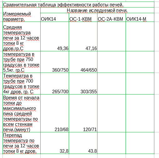 Общая таблица где буду сравнивать 4 печи с размером 500х500мм.