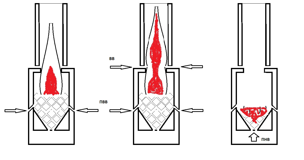 Компромиссным вариантом подачи воздуха может быть подача из боковых щелевых сопел в середину закладки. По сути это первичный верхний воздух ПВВ. Он участвует в обдуве только верхней части закладки и большую часть активной фазы он не будет проскакивать мимо дров. Таким образом мы получим горение верхней части закладки в начале фазы, и только во второй части фазы, начнет гореть низ закладки. По мере усадки закладки, боковые щели подачи воздуха становятся выше уровня топлива. Таким образом подача воздуха через эти щели становиться ВВ. Этот воздух имеет шанс поучаствовать в горении при проходе через порт. Так мы улучшим равномерность выхода летучих во время фазы активного горения.