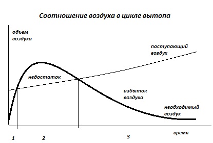 В фазе активного горения мы имеем прогретый топливник и райзер. Недостатка по самотяге и температуре нет и поступающий в топливник воздух активизирует процессы пиролиза древесины. Если пиролиз идет по всему объему закладки, то наблюдается избыток ПГ и недостаток воздуха для полного сгорания выделенного газа. При этом формально недостатка может и не быть (альфа больше 1 ). Воздух может проскакивать через закладку или подаваться в зоны где нет условий для горения, что говорит о важнейшей необходимости принятия мер для перемешивания воздуха и ПГ. Наблюдается неполное сгорание ПГ и как следствие дым в трубе. Однако в традиционных топка этот вопрос решается простым добавление воздуха , доводя альфу до значений 3-5, что приводит к значительному разбавлению теплоносителя холодным воздухом и общим снижением КПД топки. Необходимость сгладить выход летучих по всей протяженности фазы горения , приводит к двум основным мыслям