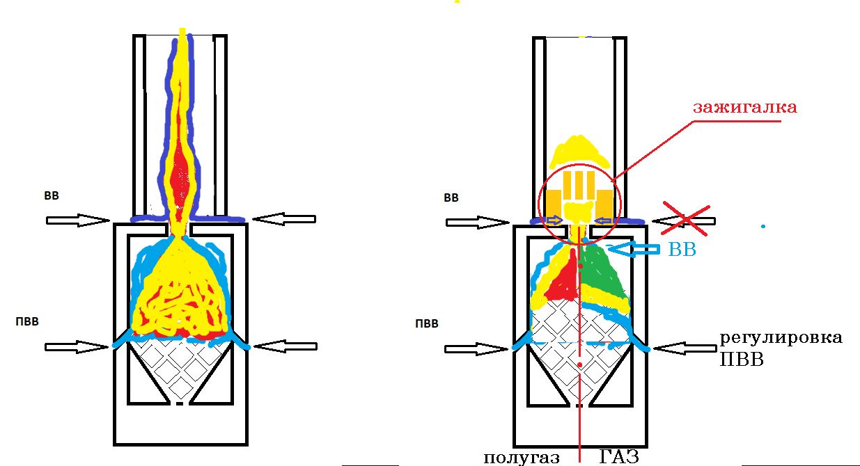 - Добавить в зону раздела зон газификации и пламенного пространства камеру дожига-зажигалку (КД-зажигалка), (см. вложение), что даст возможность работать на гомогенной смеси (на полугазе раскаляем КД-зажигалку и переходим в газовый режим)...