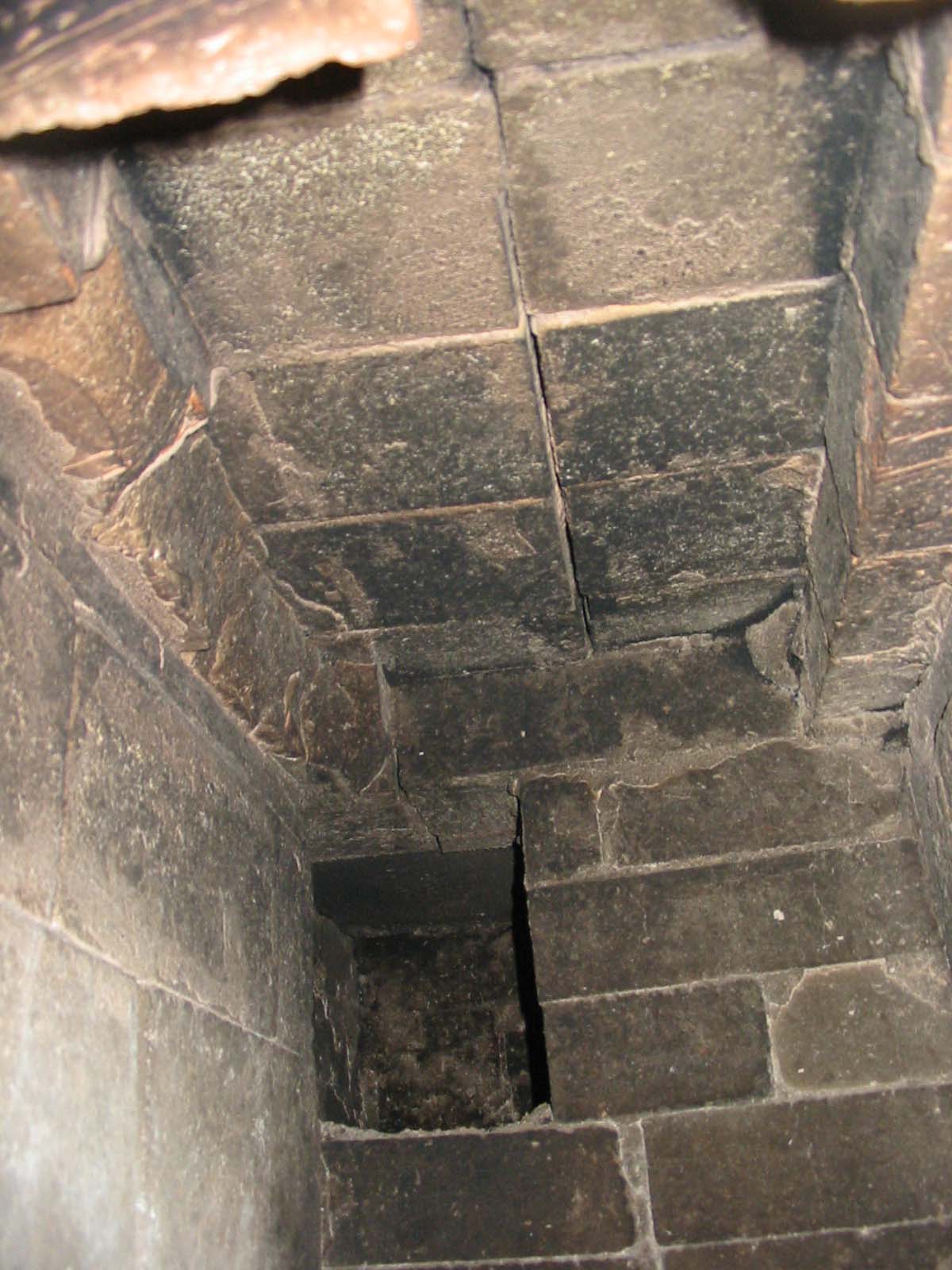 4. Самый большой "подарок" ждал меня в трубе. В распушке (борове, выдре - как правильно назвать это утолщение в месте прохода трубы через перекрытие я не знаю) вместо утолщения стенок для снижения температуры поверхности и защиты перекрытия от перегрева было сделано расширение дымового канала. Стенки трубы в месте расширения имели толщину в полкирпича (как и в остальных частях трубы), а канал расширялся. В этой "камере" откладывалась сажа и при ее возгорании, как писали здесь выше, с учетом трещин в трубе рядом с этим местом, могло полыхнуть. Самое интересное, насколько я понимаю, увидеть такой "дефект" конструкции без применения спец оборудования ("эндоскопического") практически невозможно...