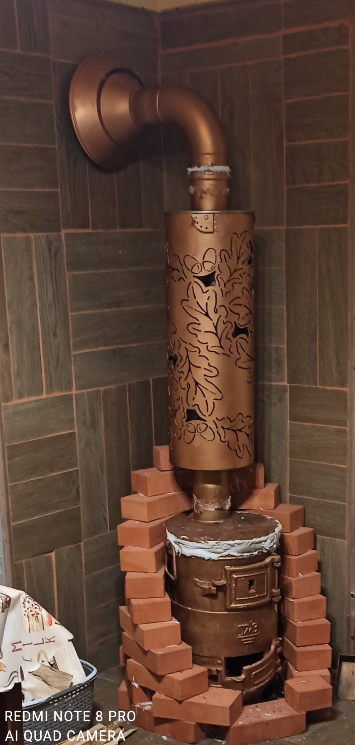 Получилось так. Единственный минус, из под крышки печи стало дымить, пришлось замазывать клеем каминфикс, и теперь вид, как-будто тесто из кадушки вылезло. Попробую закрасить той же краской что и печь с дымоходом, это если дымить больше не будет.