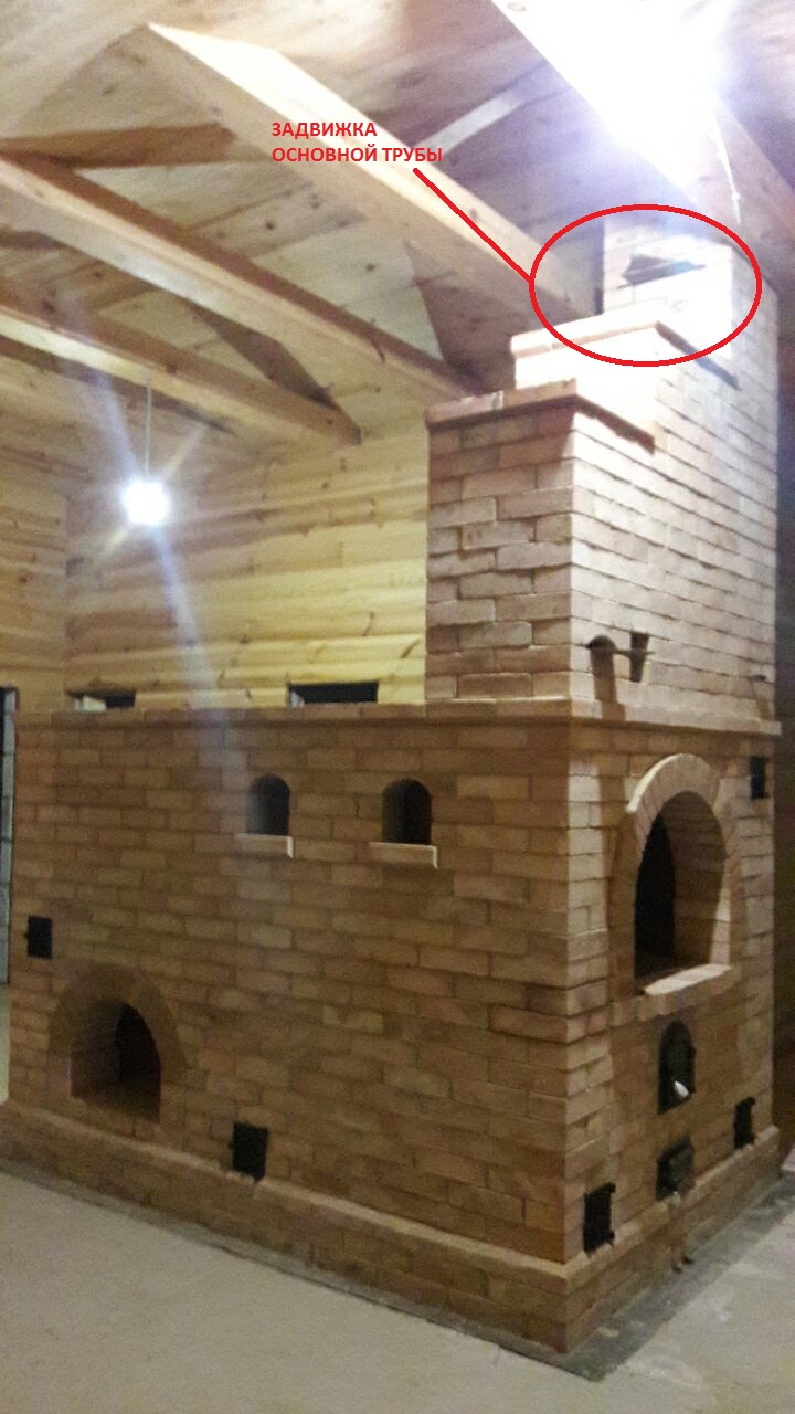 Дело в том что вот есть одна блльшая труба которая справа печи и пошла в потолок. к ней по очереди и независмо должны подключаться обе печи. Вот две задвижки по бокам вижу. Но должна еще и главная печь, кухонный агрегат как то отключаться задвижкой от трубы но независмо. т.е. к трубе можно подключить или ту или ту печь. Если у вас задвижка на трубе под потолком то кухонный агрегат при топке в зимнем режиме не отключается и мешает тяге,(точнее не отключается выход что над головой ) мешает лишним подсосом воздуха. Ну это всеравно что в обычной какой то печи в трубе взять и сделать дырку. тяга сразу ухудшится. Сфоткайте ту задвижку "у потолка".