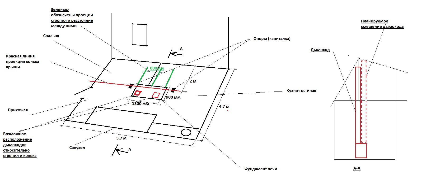 Прилагаю картинку где примерно показана проблема. Голубым цветом показано место где хотелось бы провести дымовую трубу, красным конек крыши, зеленым стропила.