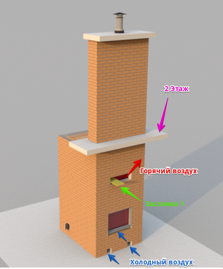 Как только камин прогреется из верхнего отверстия начинает идти горячий воздух (красные стрелки)