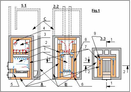 Топливник состоит из поддувала с колосником над ним, топочного пространства — 1, катализатора — 2, пространства над катализатором — 3, в верхней части которого имеются выходные отверстия в нижний колпак. В передней части топливника имеется щель — 5 для подачи вторичного воздуха из поддувала. В нижней части боковой стенки топливника может быть встроен регенератор — 6. В задней части топливника имеется сухой шов — 7 (щель шириной 3 см). Боковые стенки топливника имеют внутри полость — 8, через которую из поддувала через отверстия под колосником подается под катализатор или в него вторичный воздух. В задней части полости имеется щель — 9 шириной 5 мм для подачи вторичного воздуха в сухой шов.