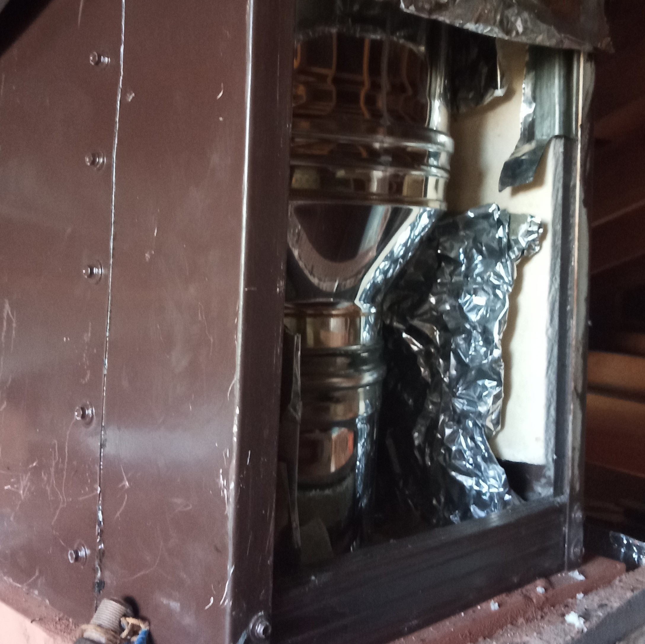 к сожалению фото большого объема, а здесь ограничения по мегобайтам. В двух словах: Сделал короб из старого холодильника, изнутри утеплил плитами каовола 1260 в этом коробе проходит сендвич труба почти вплотную к коробу. Короб выступает над крышей см 50. Далее сендвич на 50 см выше конька. Очень советую. Металл толстый и качественный, особенно у старых холодильников.