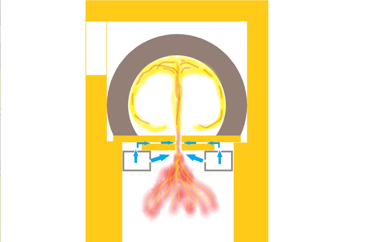 Только в отличии от всем привычных топливников в нем идет медленное горение при котором в пламени содержится много не сгоревших горючих газов (пирогазов), которые сгорают в камере дожига, проходя через форсунку, в которую подаётся вторичный воздух...