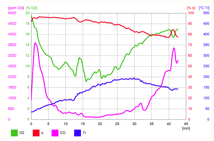 А теперь итоговый расчёт: 27,8 кг сухих дров при КИТ 95 % при протопке длительностью 100 минут выдадут в райзер удельную мощность аж 63 кВт/ч, причём с хвостиком...