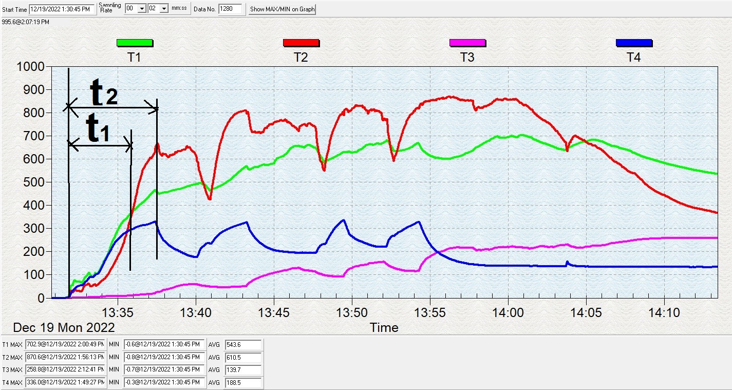 Как Вы откомментируете процесс первичной растопки t1 и t2? - Легко: при растопке полностью открыто поддувало и "Задвижка Прямого Хода", которая не совсем задвижка, а поворотная керамическая плита (железо там сгорает на раз).