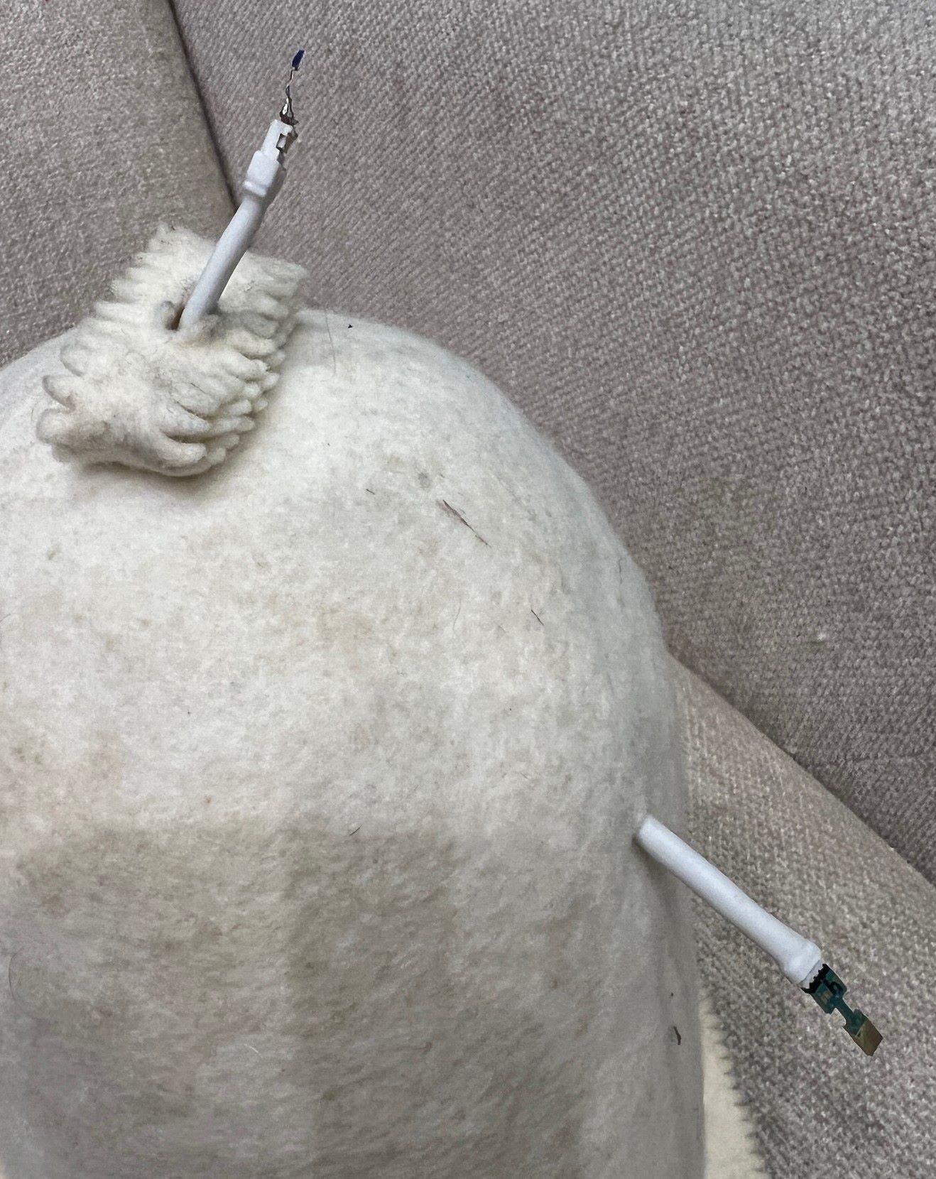 Провода каждого датчика планирую продеть через фторопластовую трубку, чтобы все датчики распологались на одинаковом расстоянии от шапки и они не болтались как сейчас.