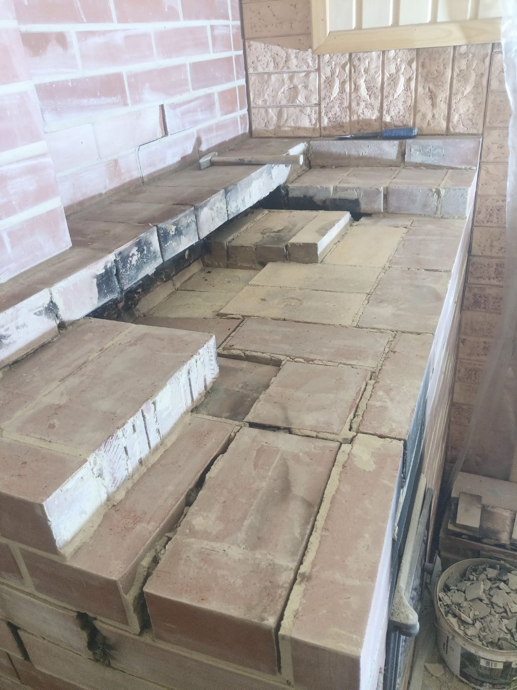 В некоторых местах нет перевязки. Топка из шамотного кирпича соприкасается с основной стеной, что сделана в полкирпича. Дымоход размером 60*60мм от каменки.Часть свода топки не опирается вообще ни на что (кирпич одной стороной висит только на глине, второй на клине. И т.д.